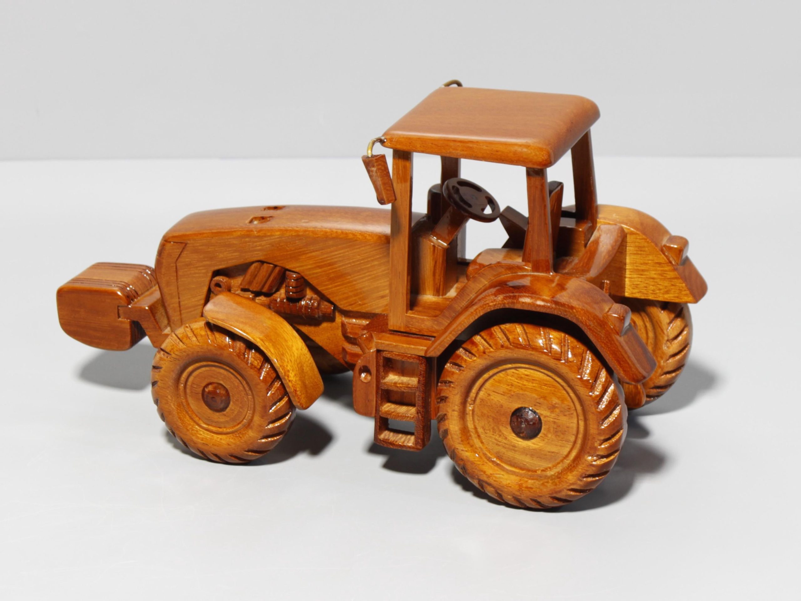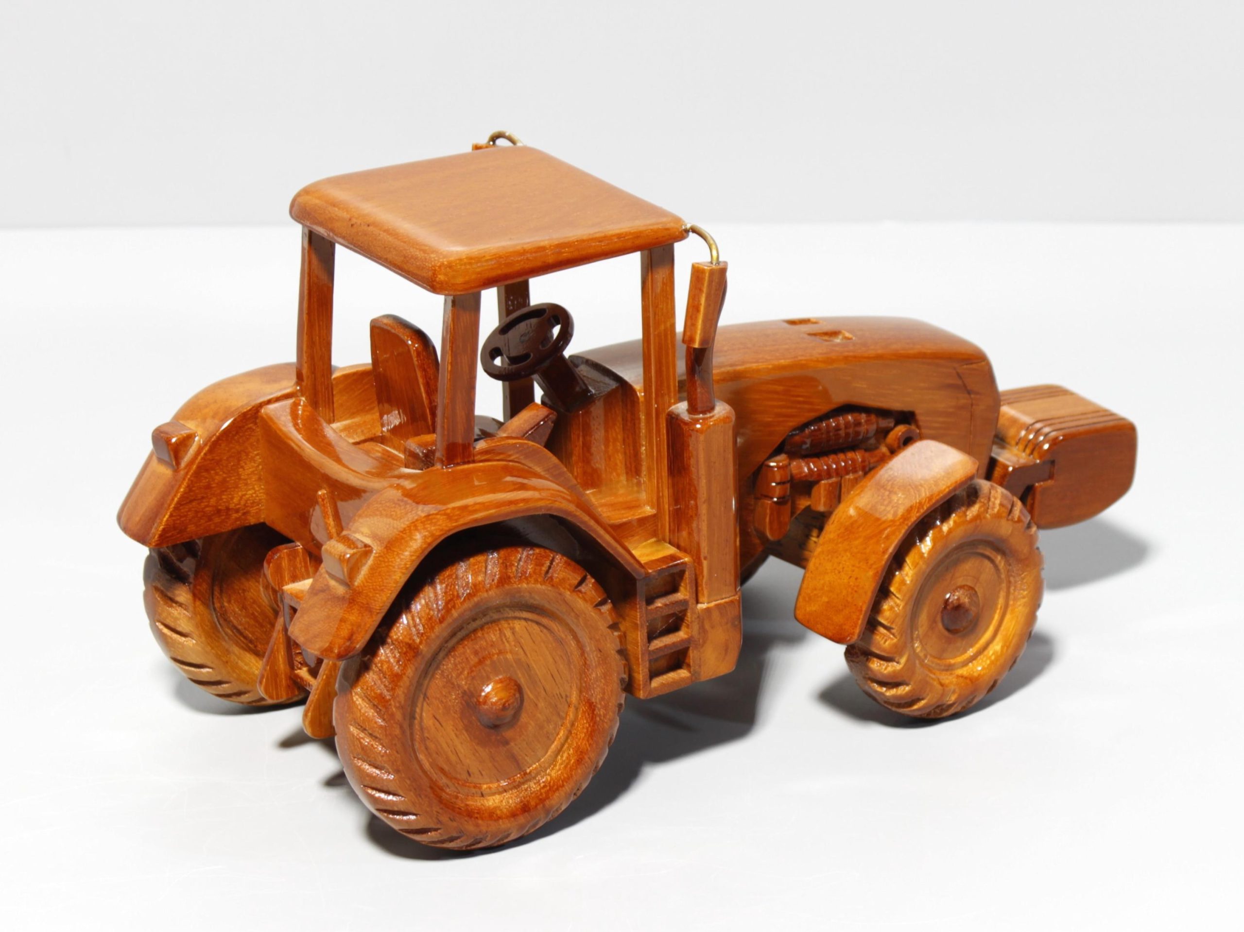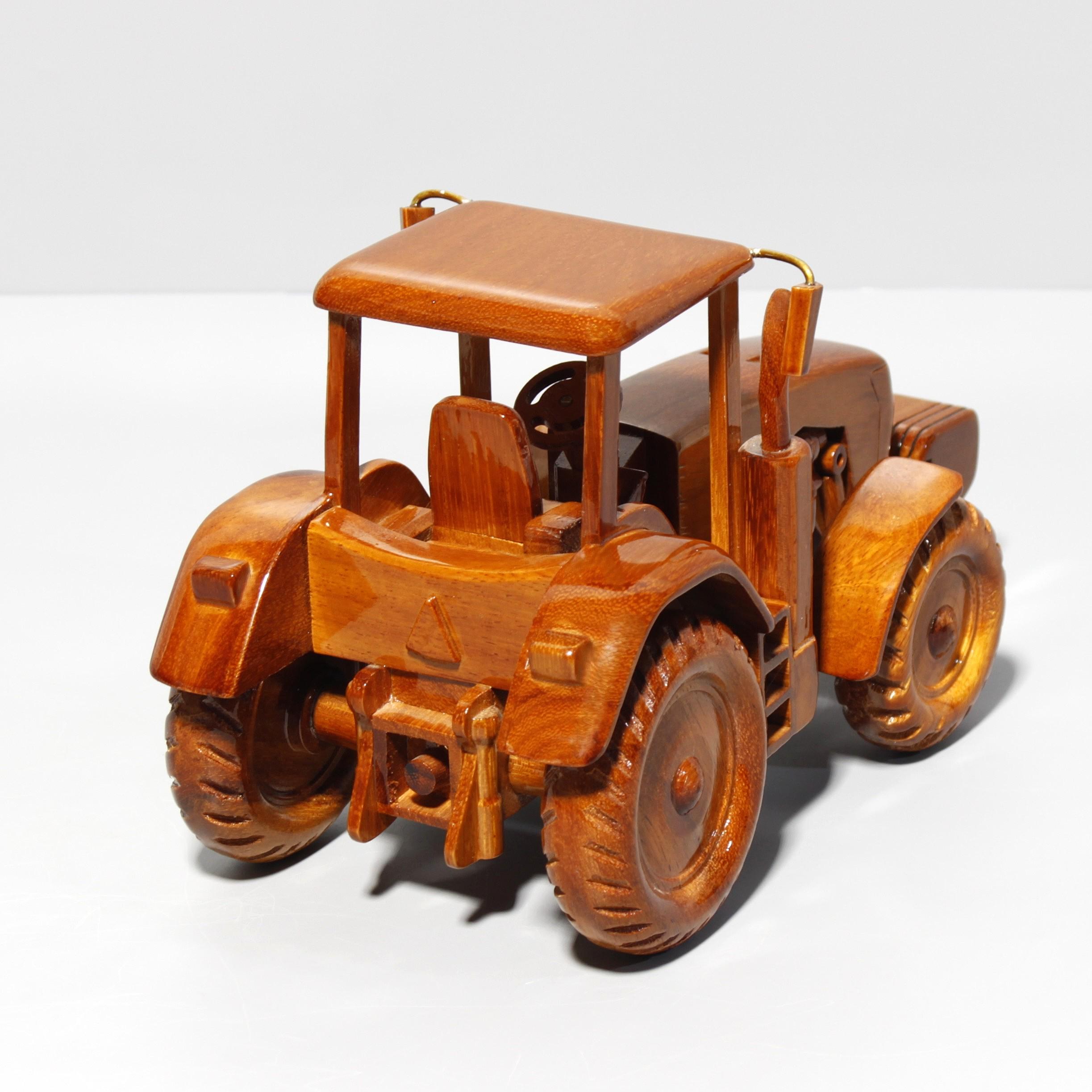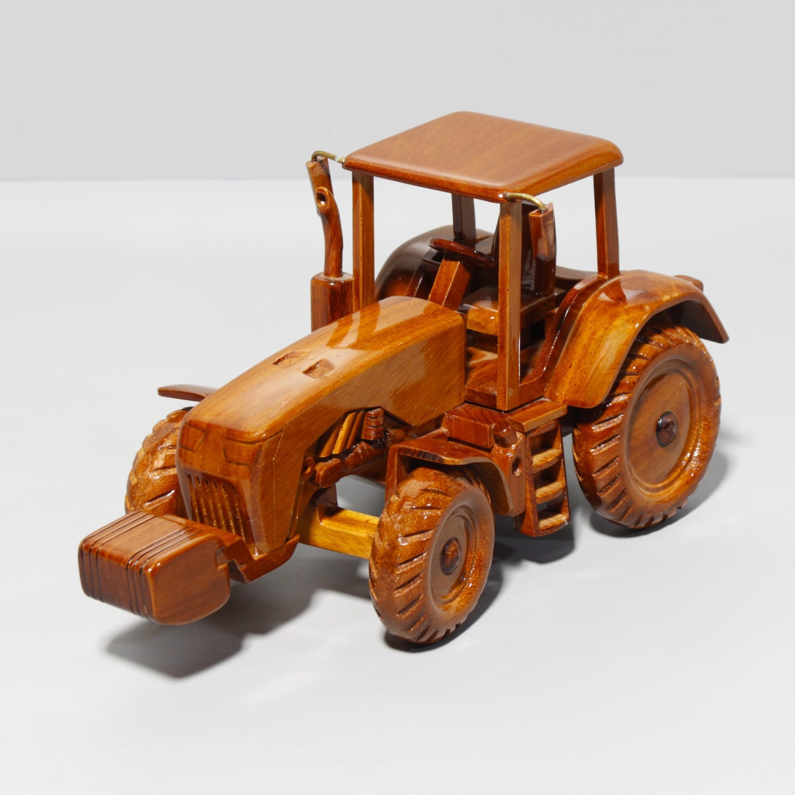Inspired by classic farm machinery, this hand carved wooden tractor model captures the sturdy form, functional structure, and timeless character of agricultural equipment. Its raised canopy, detailed wheel design, and balanced proportions give the piece a strong visual presence while preserving a warm and artisanal appeal.