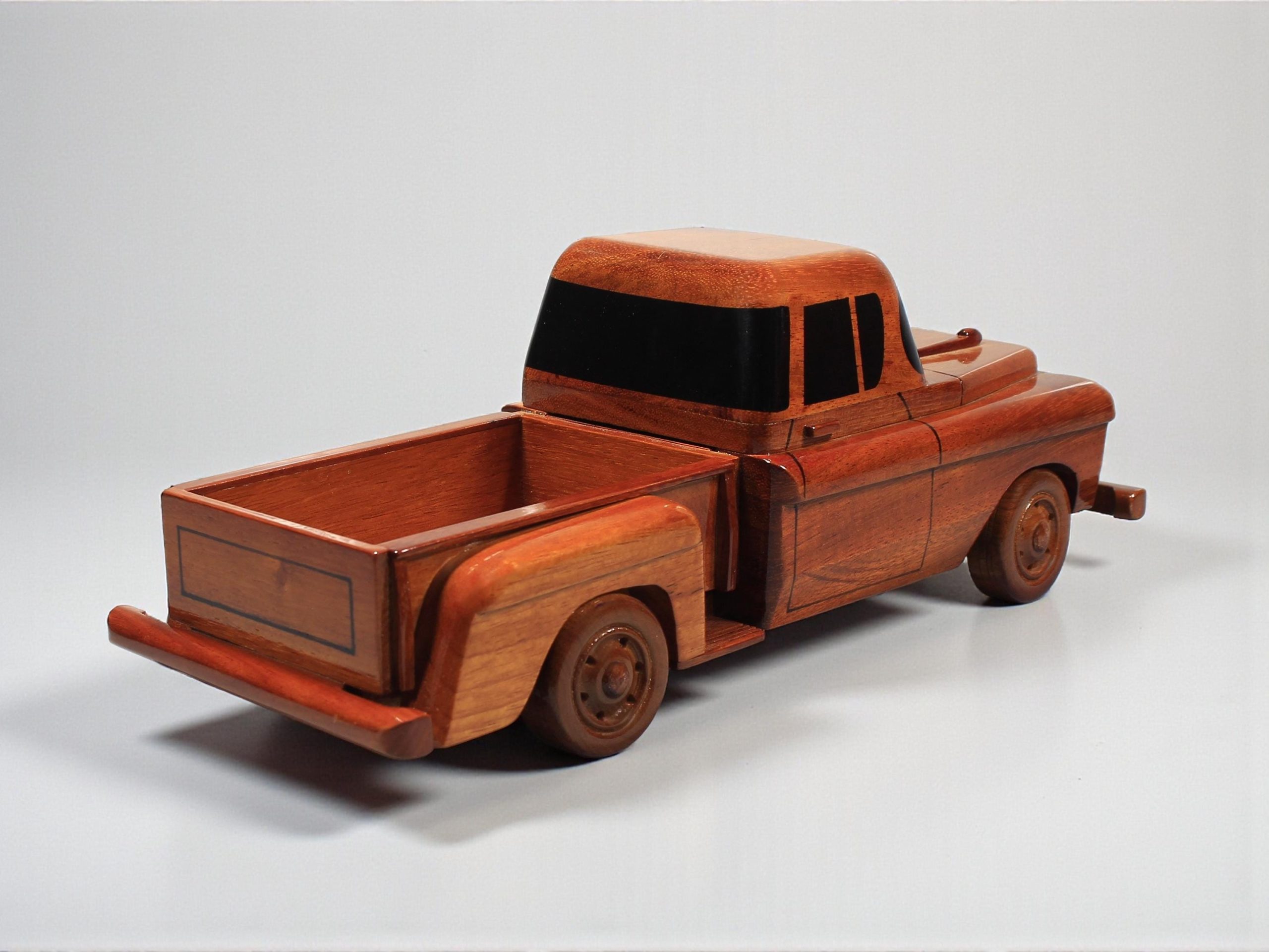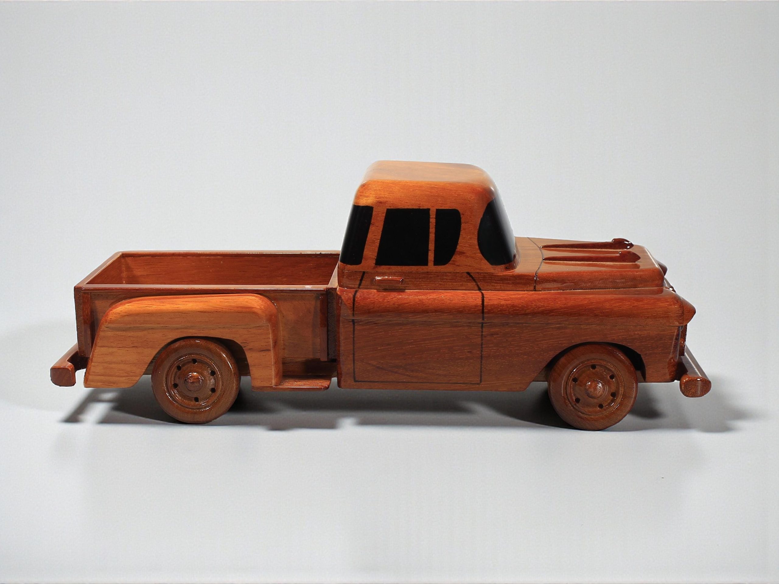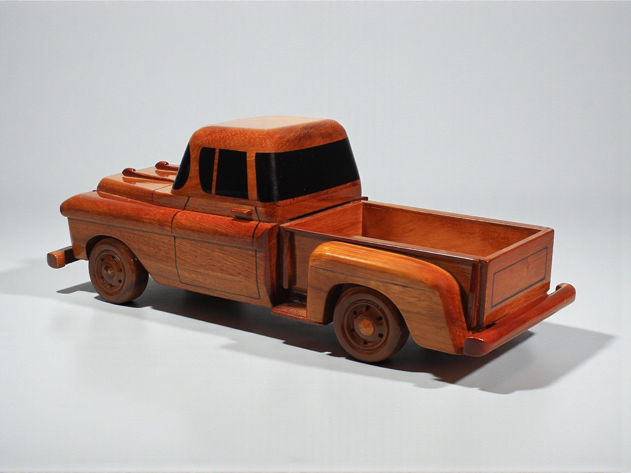 Inspired by classic mid century pickup trucks, this hand carved wooden model captures the bold front grille, compact cab, and open bed design that define timeless utility vehicle styling. Its balanced proportions, smooth contours, and sturdy silhouette give the piece a warm, nostalgic presence while maintaining a refined collectible appeal.