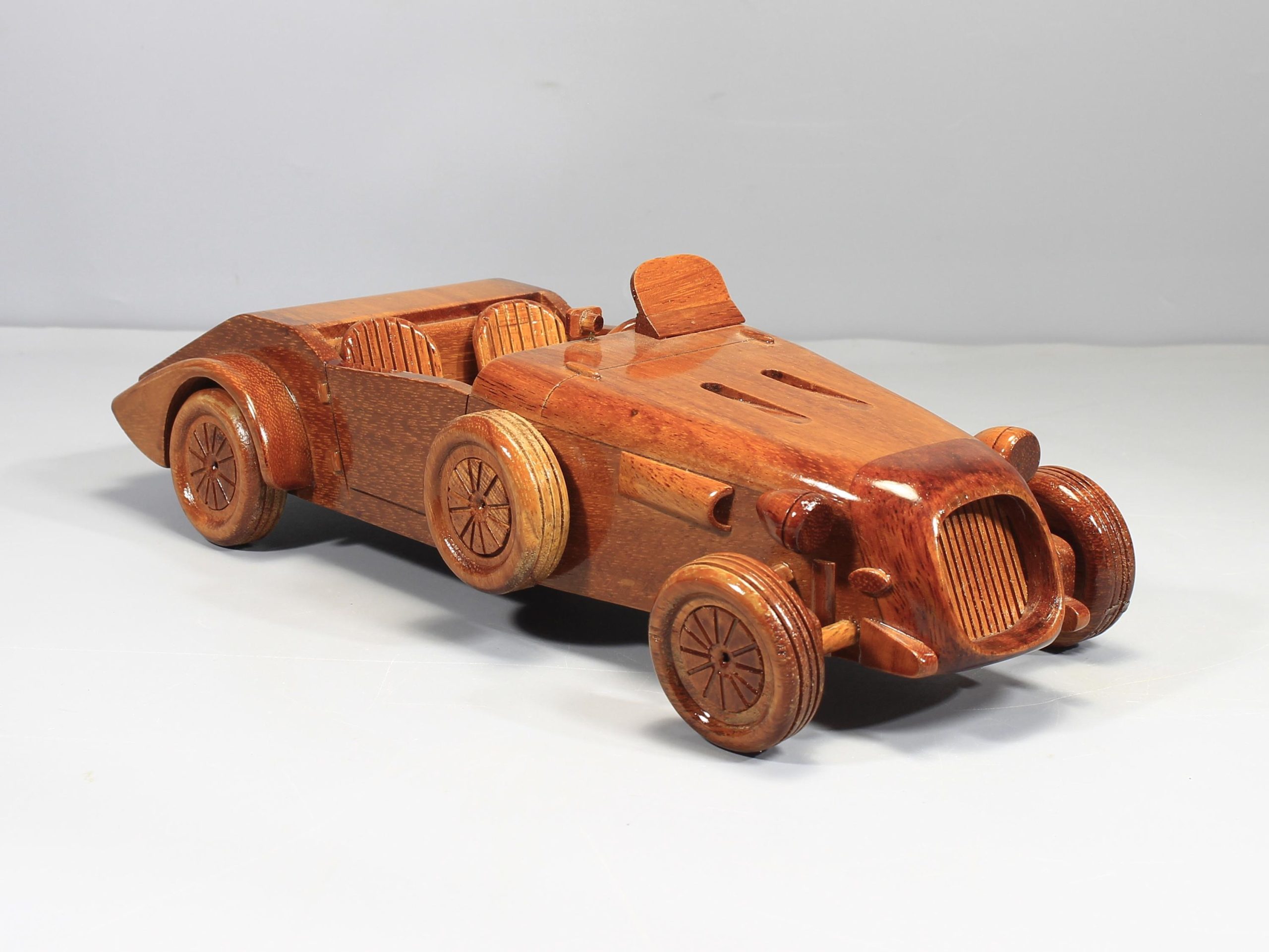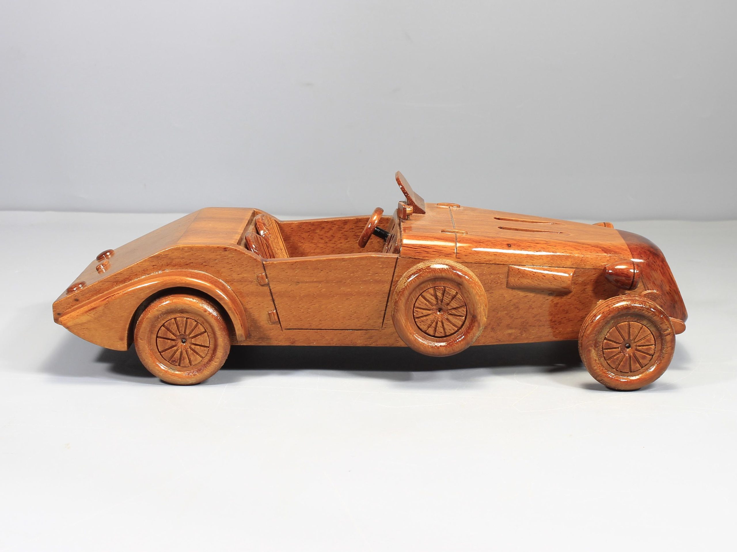 Inspired by early open top motoring icons, this hand carved wooden roadster captures the elongated hood, exposed wheel styling, and elegant proportions that define classic automotive design. Its flowing silhouette and finely balanced form give the piece a distinctive presence that feels both nostalgic and refined.