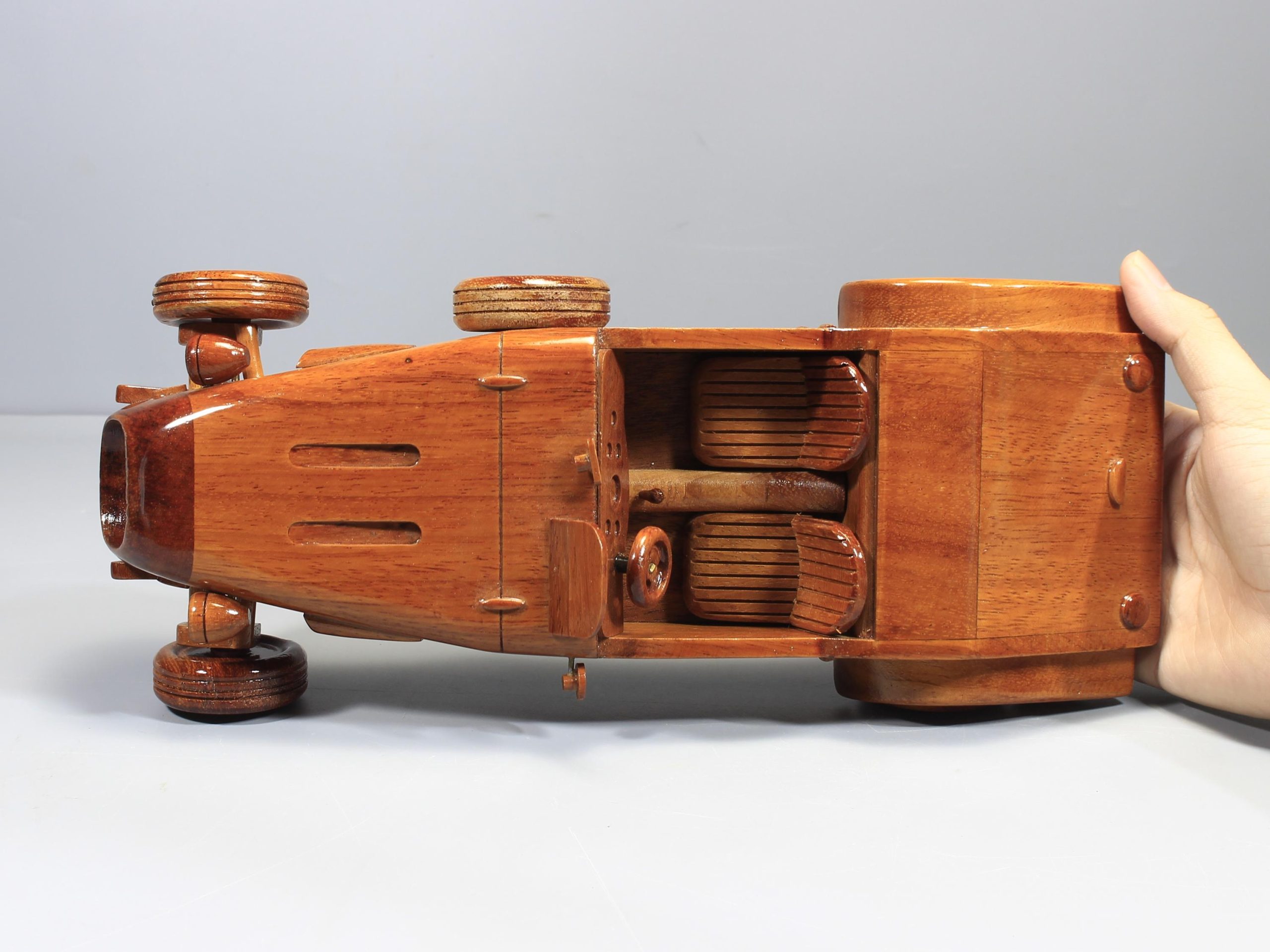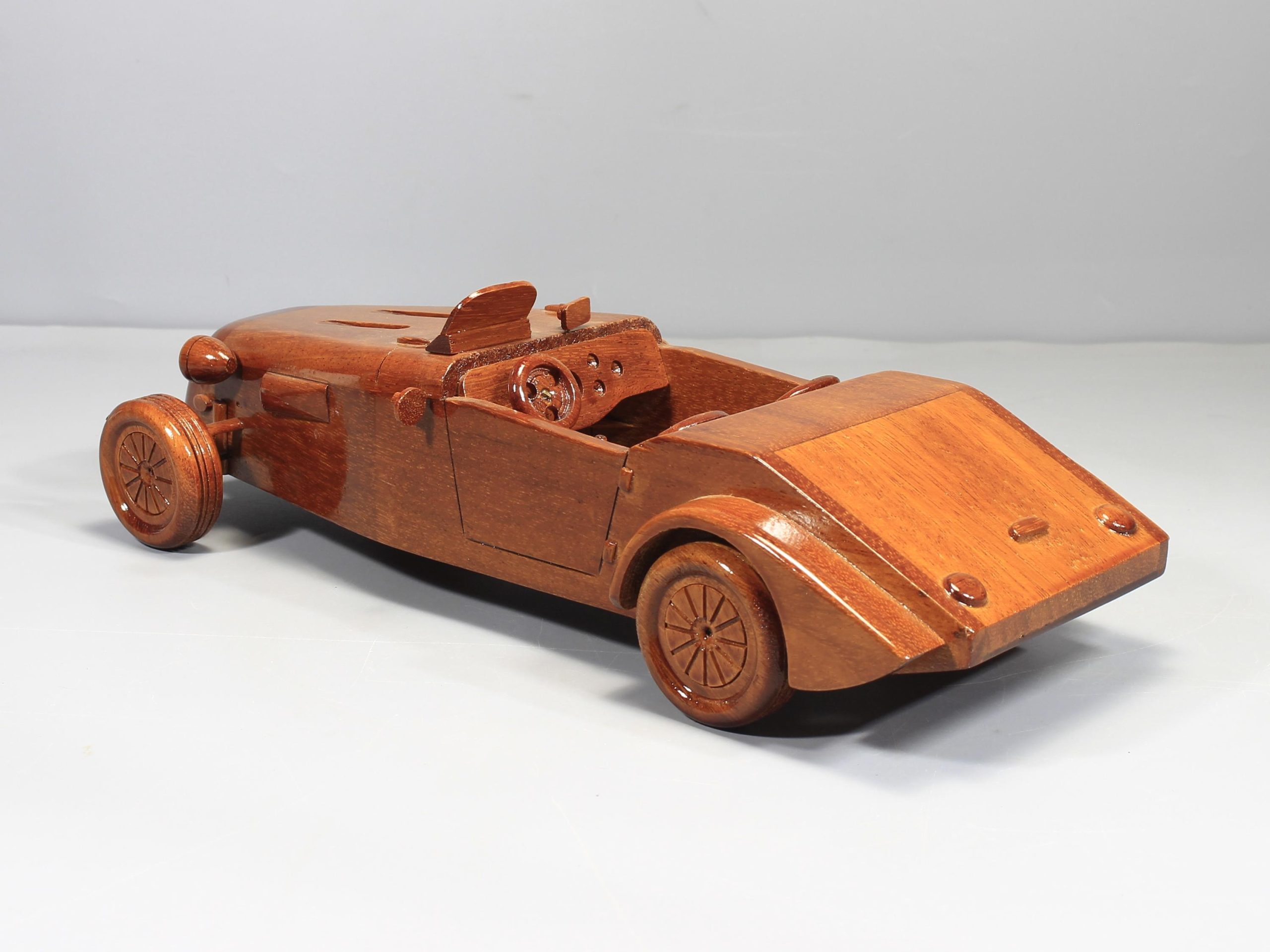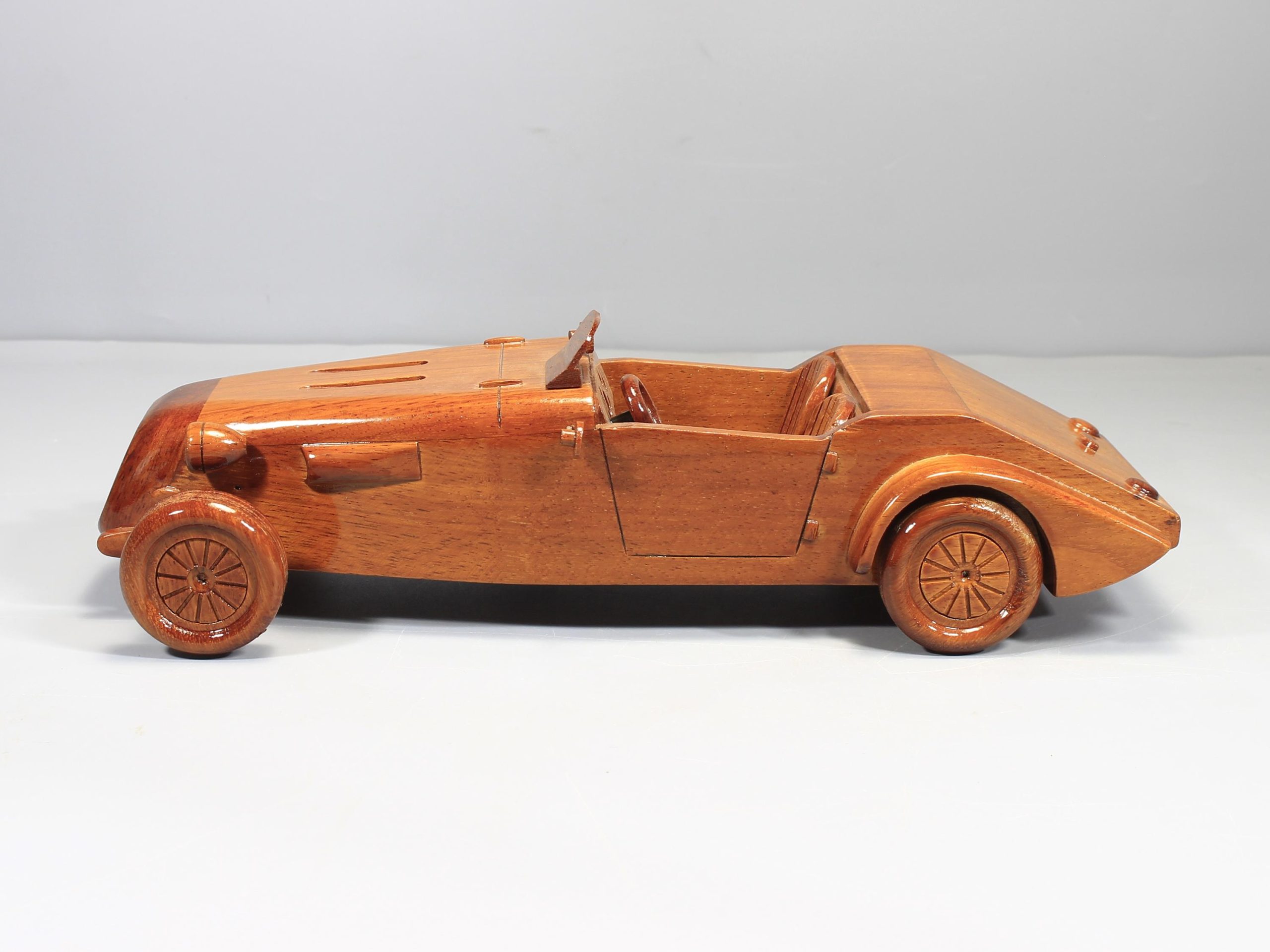 Crafted from solid premium mahogany, each model is individually shaped and finished by hand. Careful sanding and polishing bring out the natural richness of the wood grain, while a high gloss lacquer adds depth, warmth, and a smooth polished finish. The result is a sculptural display piece that celebrates vintage craftsmanship through a timeless automotive form.