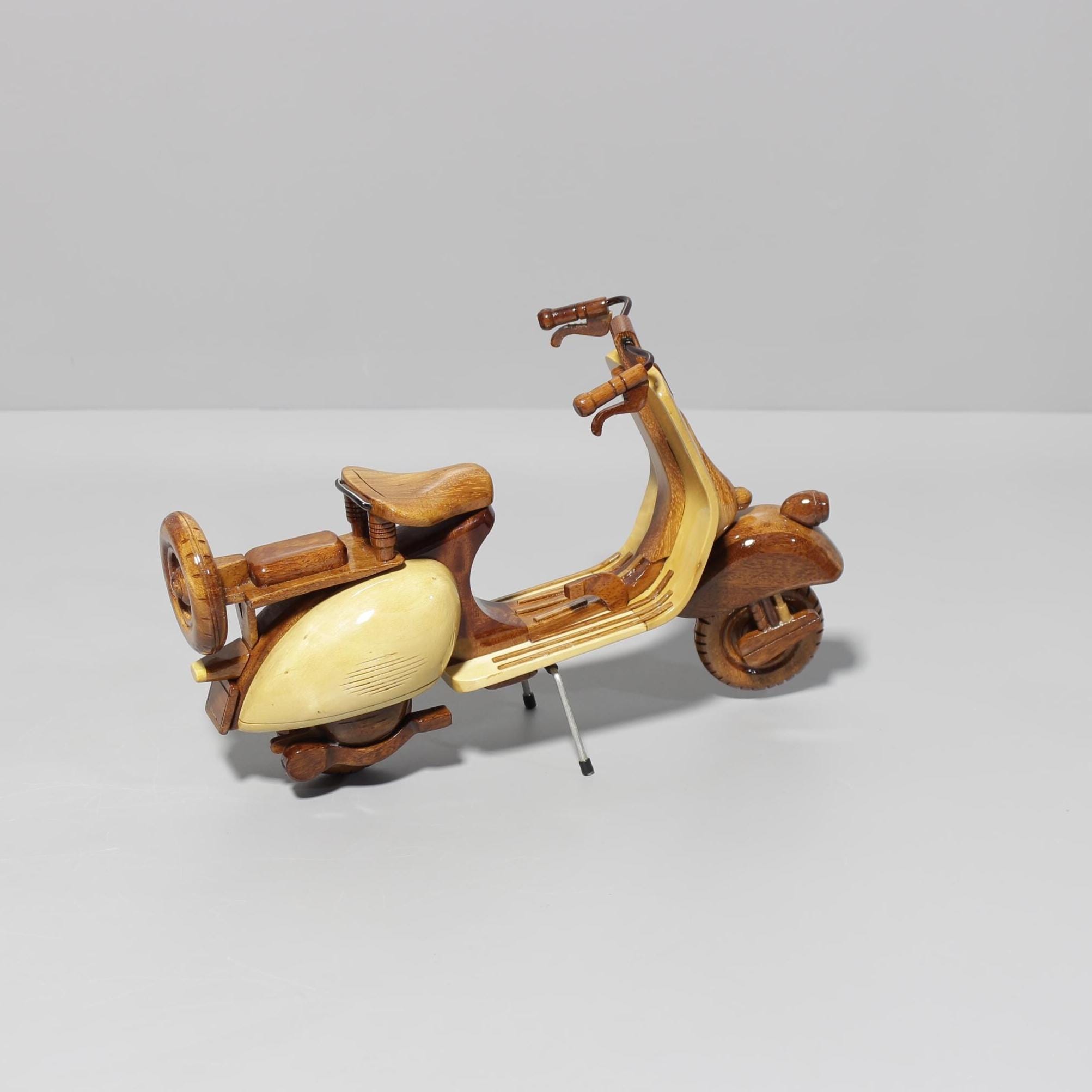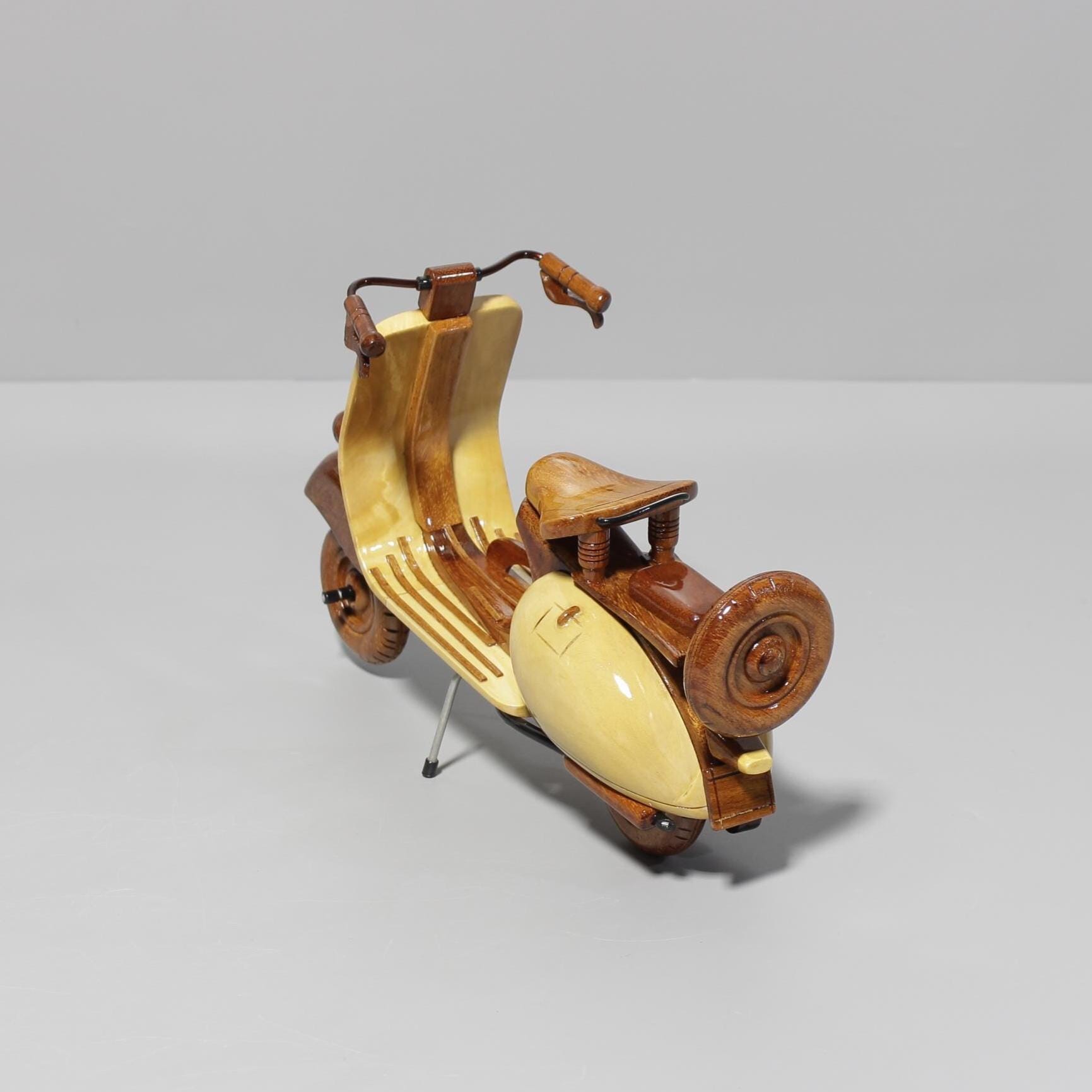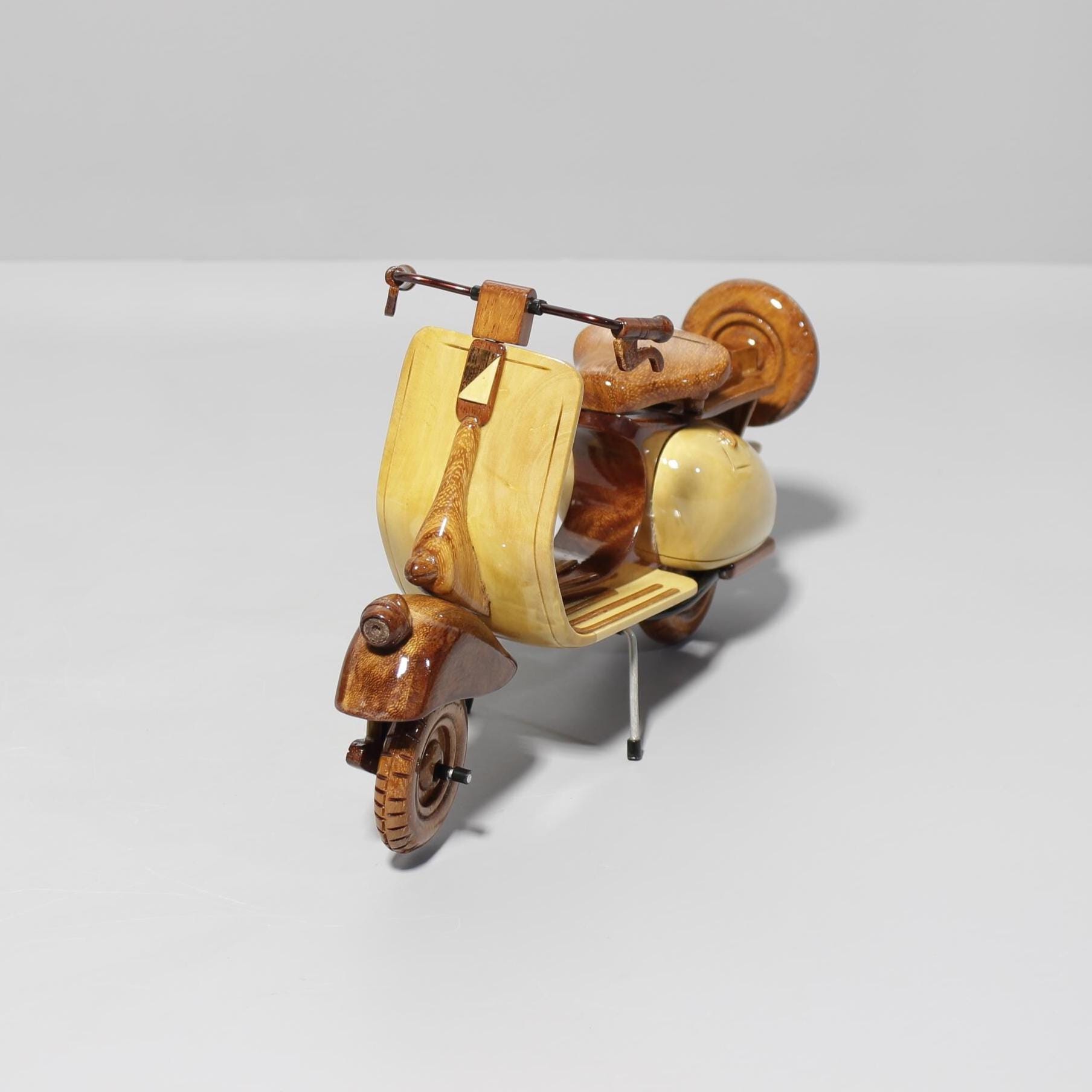 Inspired by iconic mid century scooters, this hand carved wooden model captures the compact silhouette, smooth curves, and playful elegance that define classic European scooter design. Its rounded body, step through frame, and retro proportions create a charming yet refined presence.