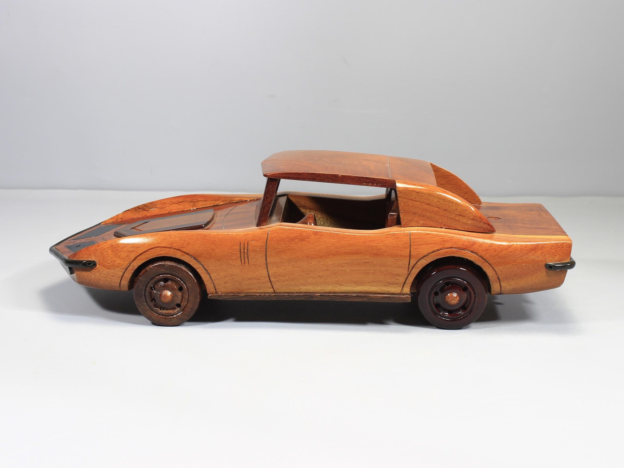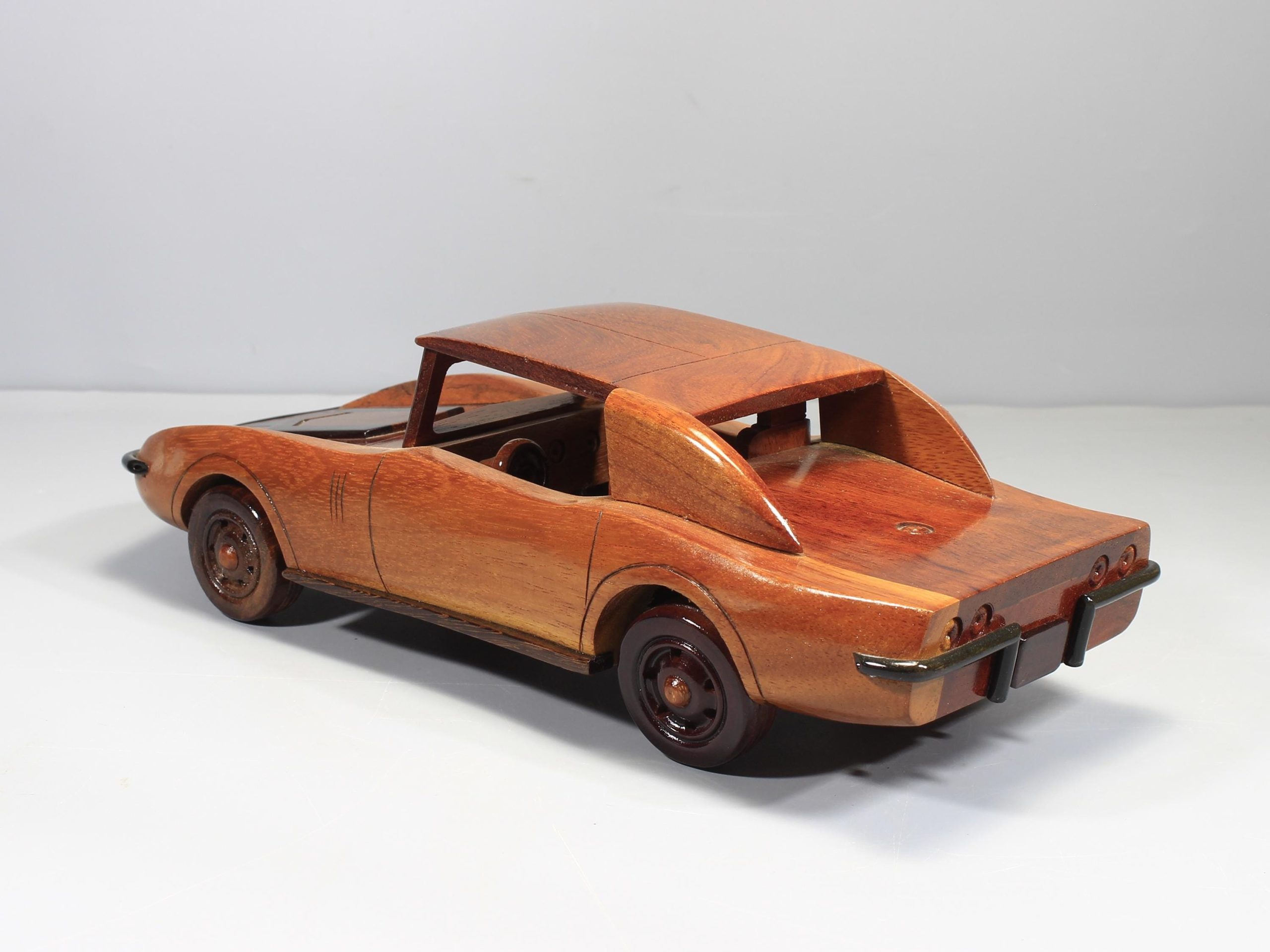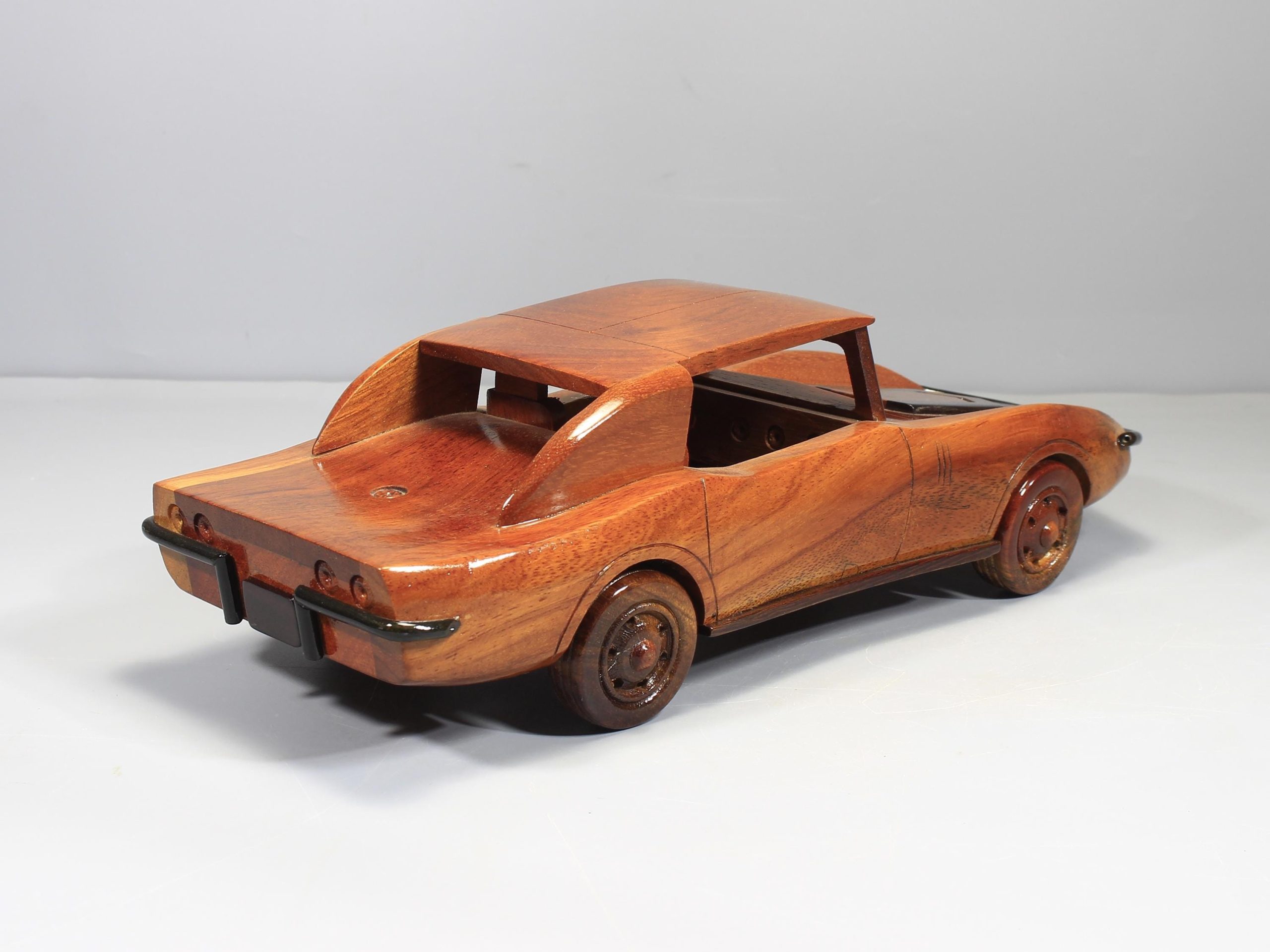 Crafted from solid premium mahogany, each model is individually shaped and finished by hand. Careful sanding and polishing enhance the richness of the natural wood grain, while a high gloss lacquer adds depth, warmth, and a smooth refined finish. The result is a sculptural display piece that blends retro automotive character with artisan craftsmanship.