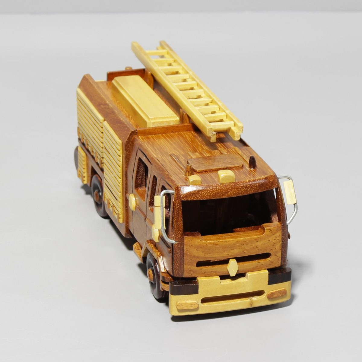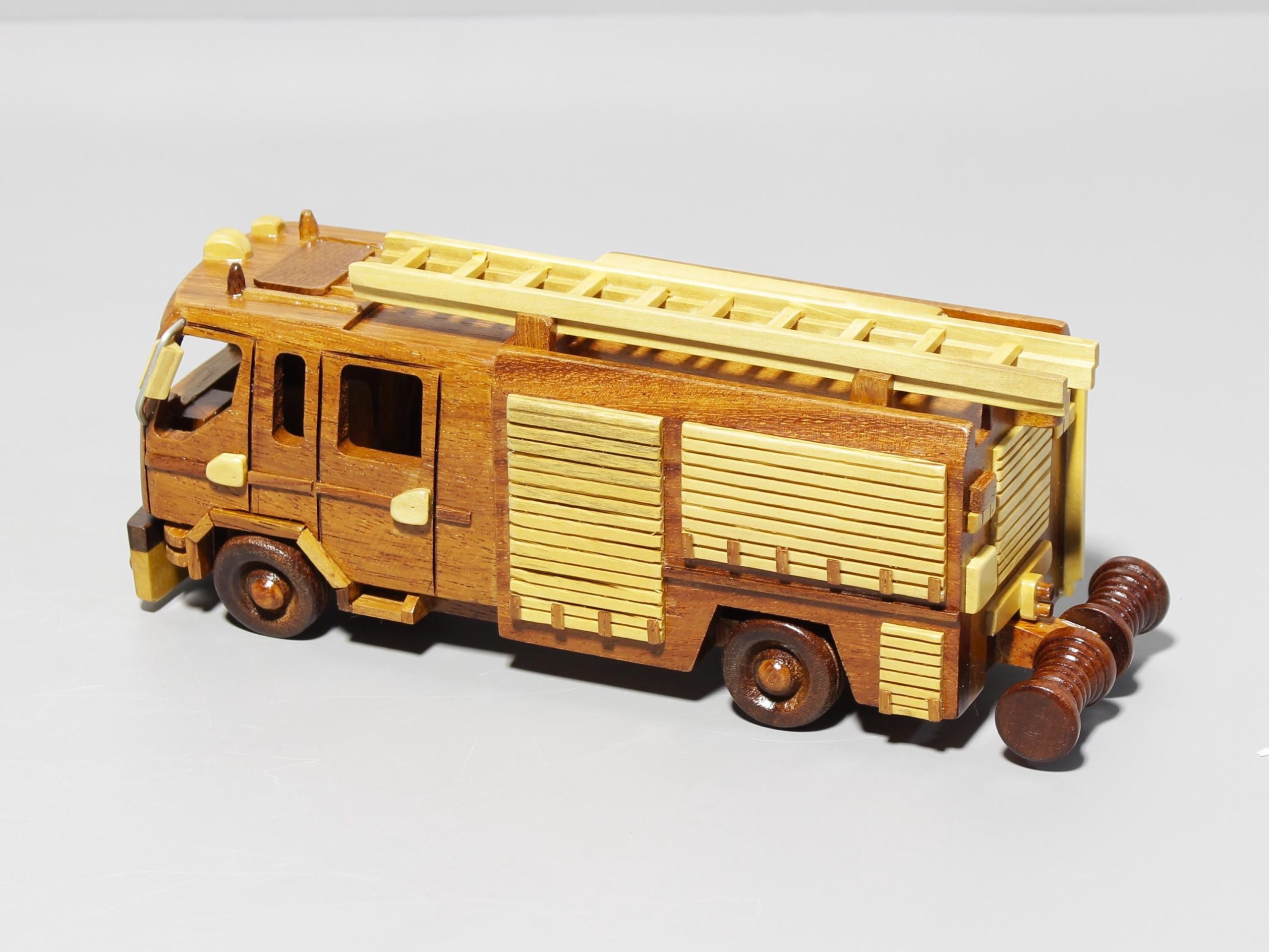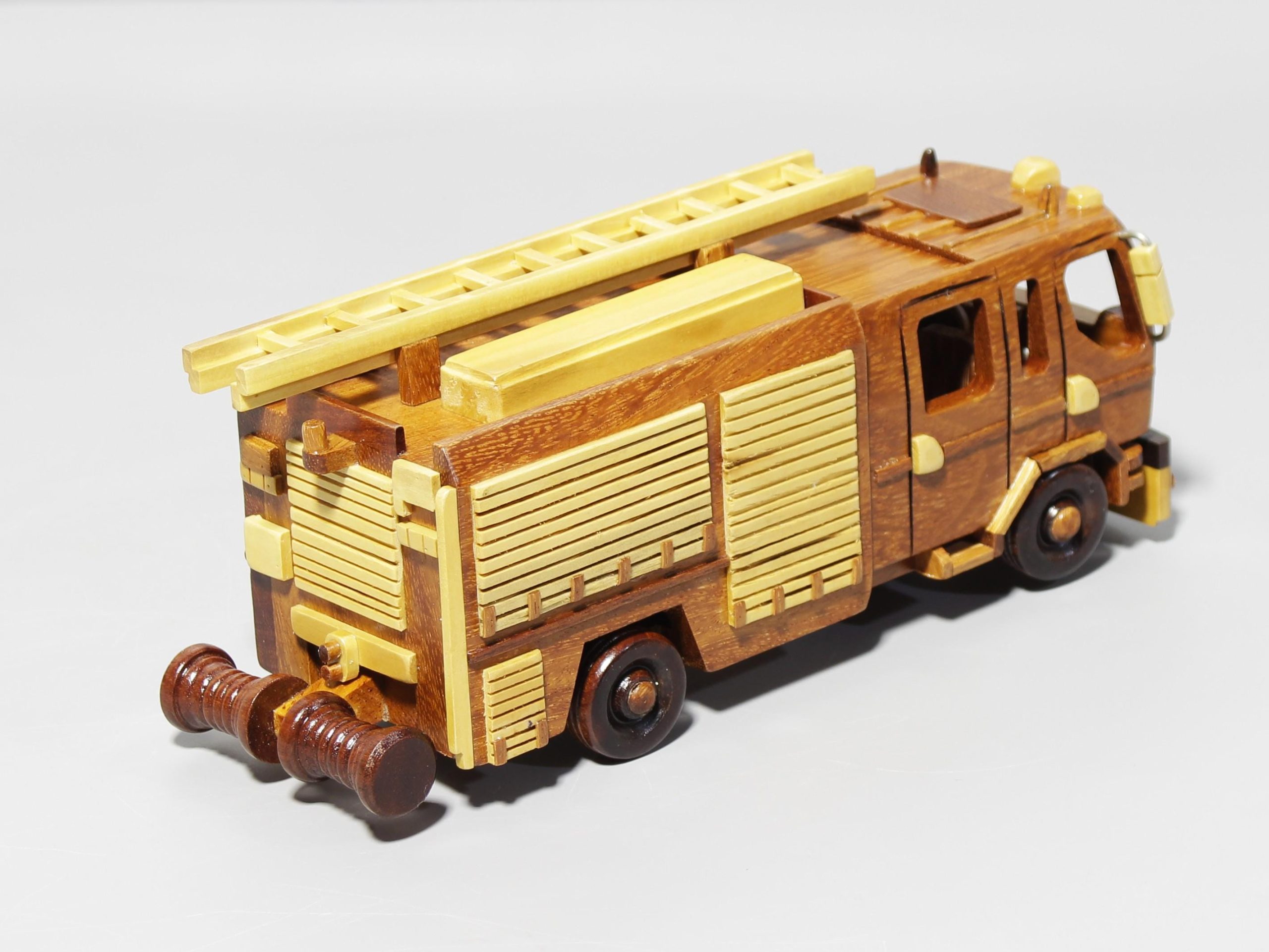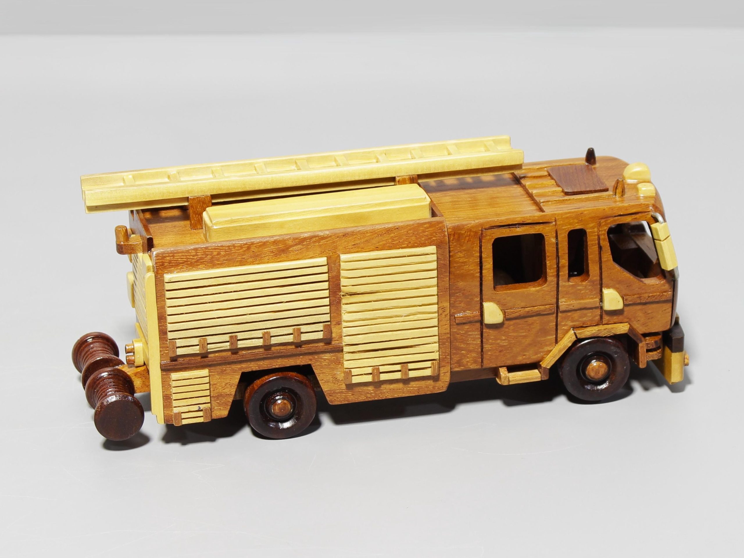 Inspired by classic emergency response vehicles, this hand carved wooden fire truck model captures the bold structure, utility focused design, and distinctive ladder detail that define iconic rescue transport. Its layered body, clean geometric lines, and contrasting wood tones give the piece a strong visual presence while preserving a refined handcrafted appeal.