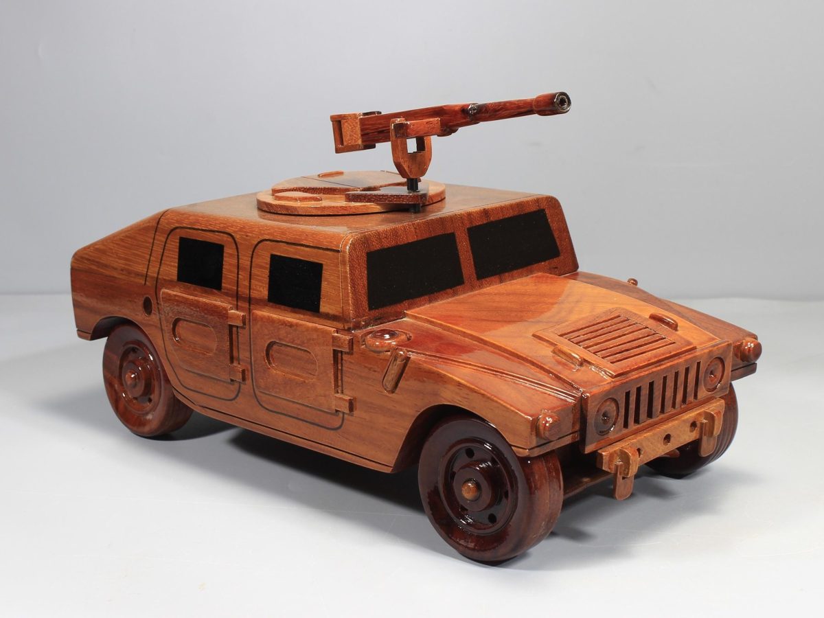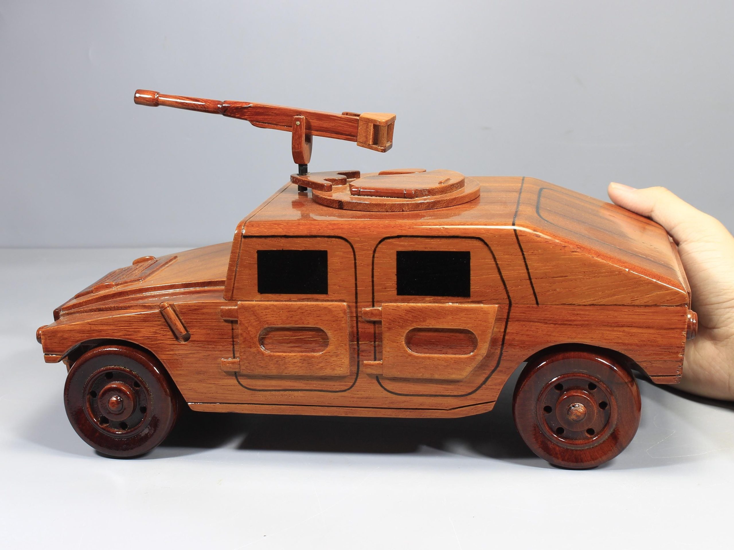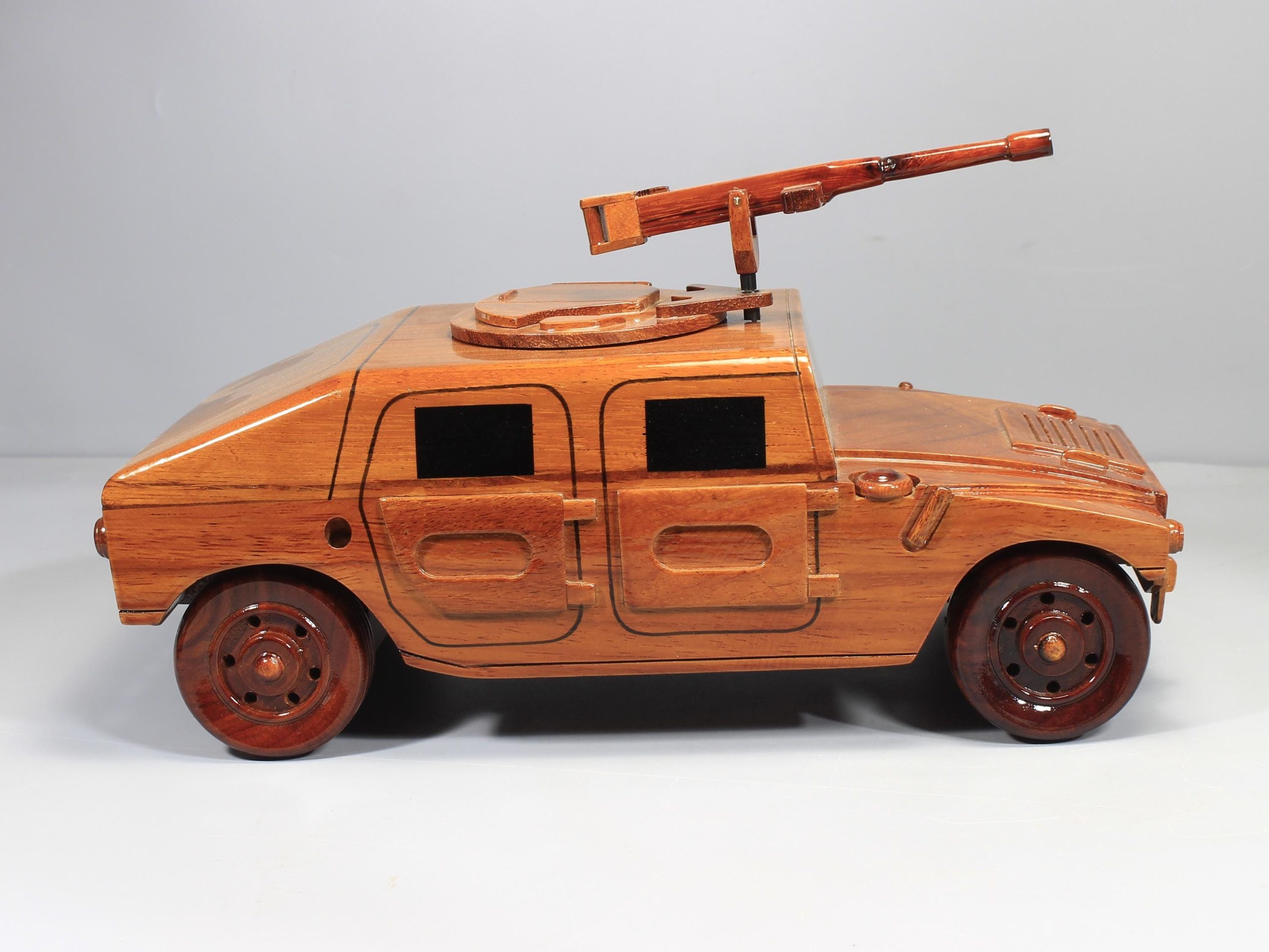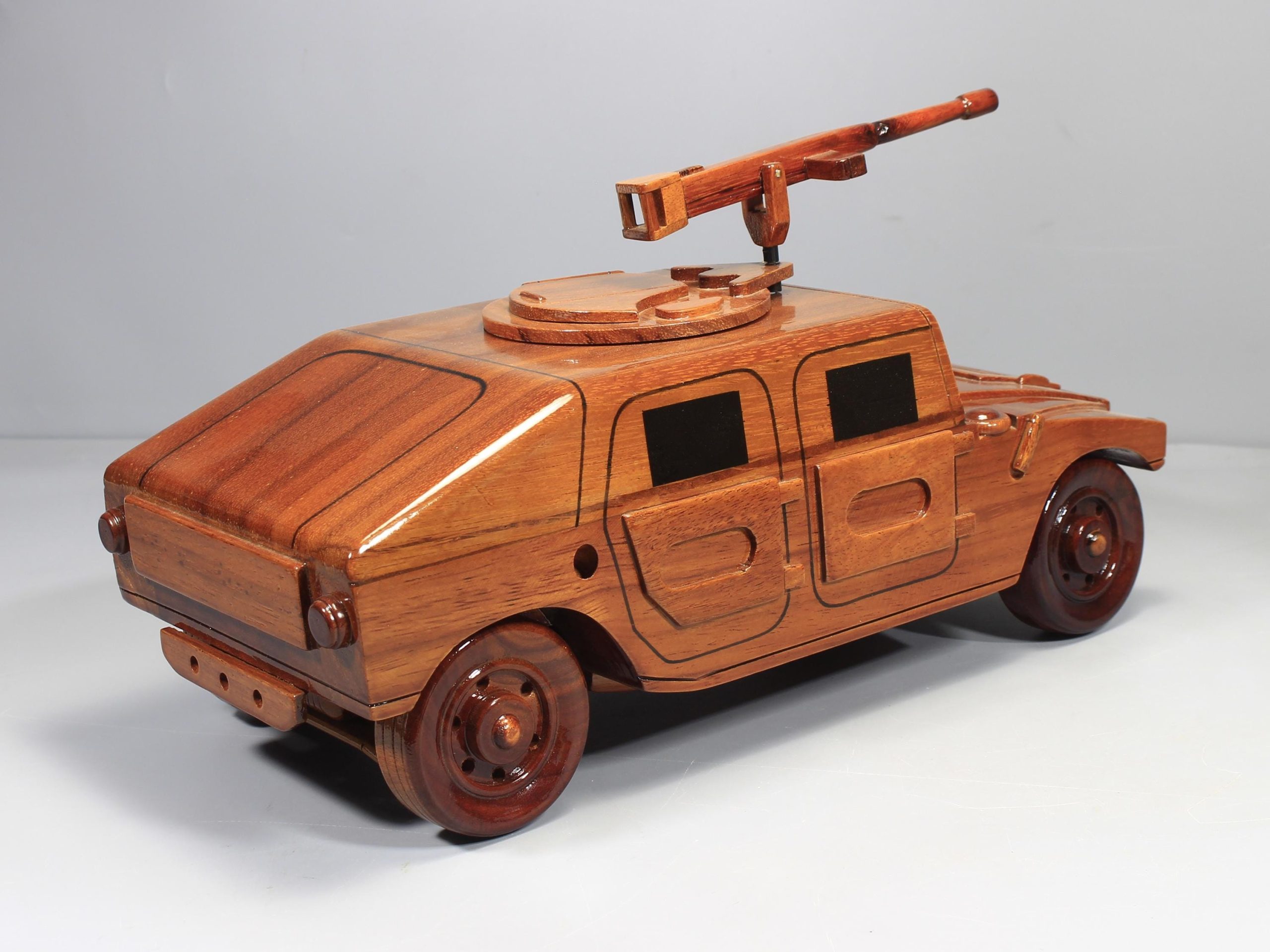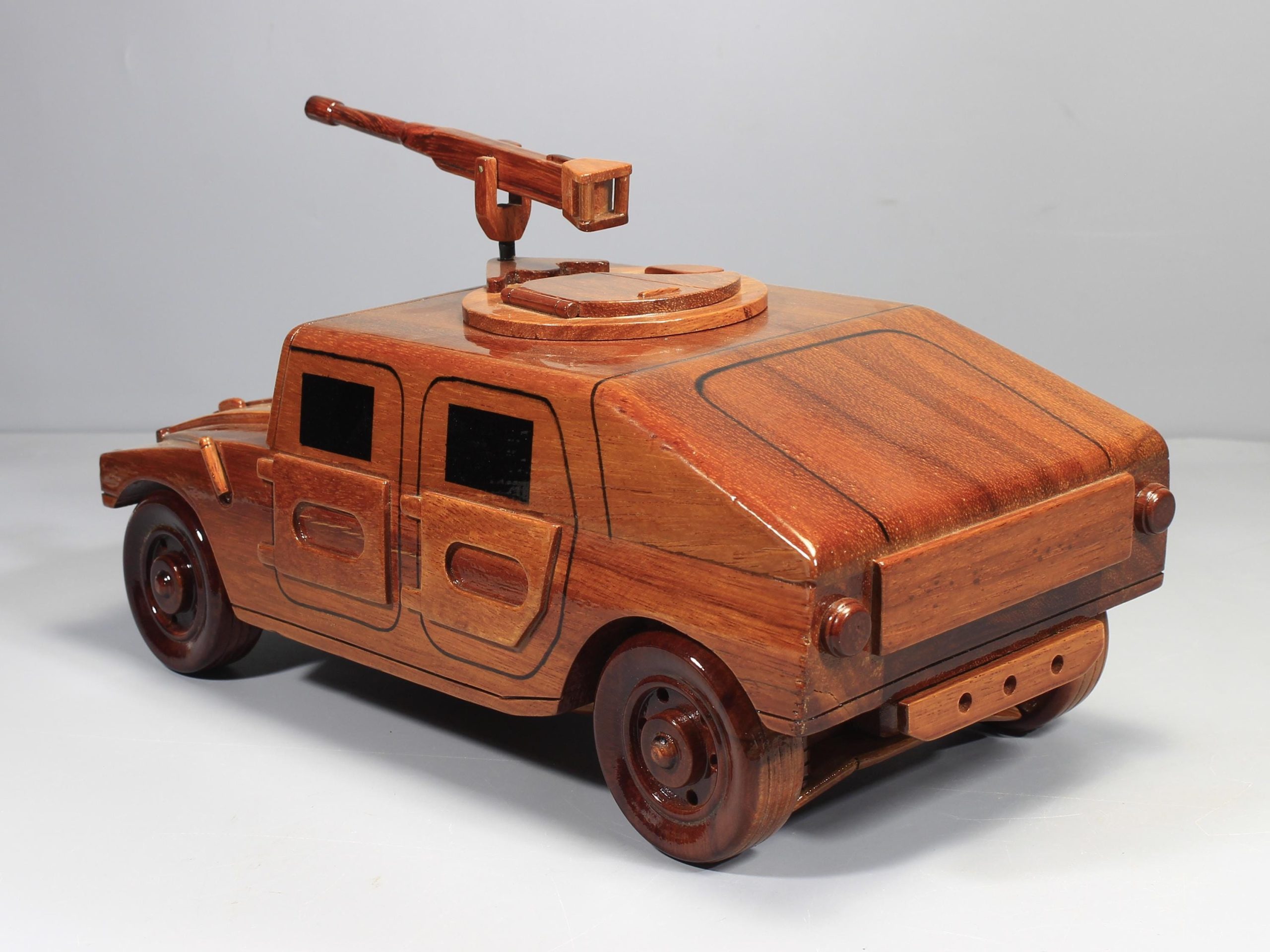 Museum Grade Hand Carved Mahogany Armored Off Road Vehicle Sculpture with Turret Detail, Luxury Wooden Military Model